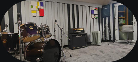THE RED ROOMAir conditioned and acousticaly very controlled with decoupled walls and a floating floor, and designed to feel like a comfortable living room - this is a great room for writing and perfecting new songs. Equipped with a 5 piece Mapex M drum kit, 3 x Guitar Amps, 1 x Bass amp, and an 8 channel Mackie PA with 3 mics.