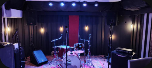 THE WHITE ROOMAcousticaly very dead - this is a slightly smaller room, suitable for 4-5 piece bands only. Yamaha Stage Custom kit, 3 x guitar amps, 1 x bass amp and 8 channel Laney PA with 3 mics.This is the only room not currently air conditioned.